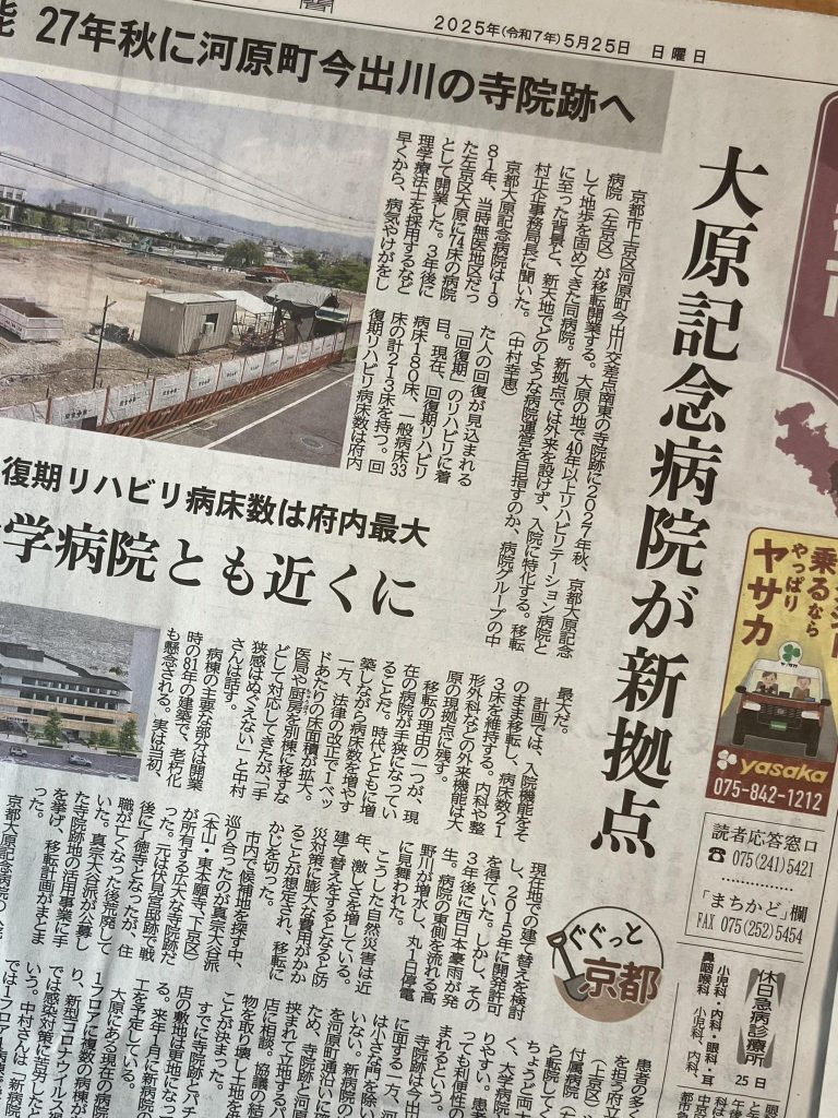 May 25 2025 京都新聞(5/25)に掲載されました! 5月25日(日)京都新聞朝刊に京都大原記念病院 移転に関する記事が掲載されました。 Tweet 関連記事 2017年11月30日 【京都新聞掲載】医療情報室⑥脳のリハビリテーション 京都大原記念病院 垣田院長が回答 2016年9月01日 【新着情報更新!】通所リハビリ、デイサービス等の取り組みを紹介しています! 2017年4月19日 地域人第20号(発行:大正大学) 京都大原記念病院グループ代表の対談が掲載!! 看護師対象 お仕事相談会 開催のお知らせ 京都大学 藤原正幸教授をお招きし「水と人のかかわり」をテーマに職… 記事一覧