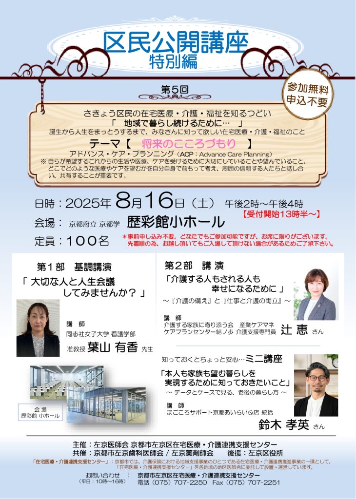 8月16日(土)、京都府立 京都学・歴彩館 小ホールにて「第5回さきょう区民の在宅医療・介護・福祉を知るつどい」が開催されます。