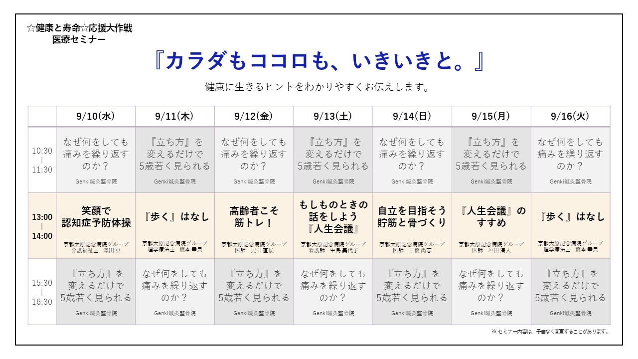 大丸京都店が主催する「 ☆ 健康と長寿 ☆ 応援大作戦 」 内の「医療関係セミナー」に、京都大原記念病院グループのスタッフが7日間連続で登壇します。家族みんなで⭐︎身体・ココロ⭐︎を健やかに自分らしく生きるための健康づくりにお役立てください。
